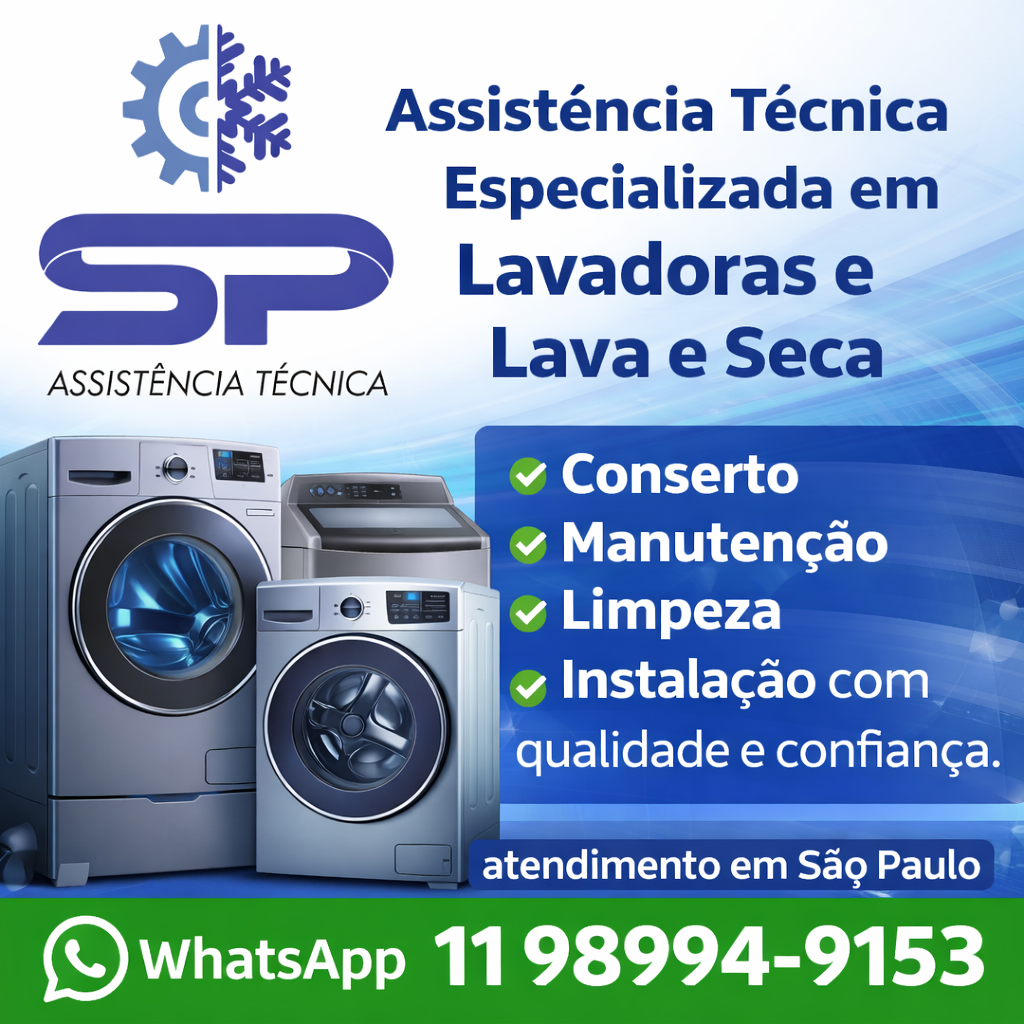 Assistência técnica especializada em conserto, manutenção, limpeza e instalação de máquinas de lavar roupa e lava e seca, com atendimento rápido no local, diagnóstico preciso e serviço de confiança para deixar seu equipamento funcionando perfeitamente novamente. Atendimento em São Paulo e região. Solicite seu orçamento.